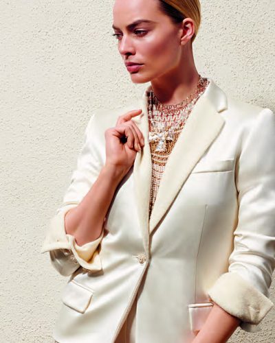 But unlike women of that era (Kim Basinger’s Wikipedia page reads, “Hailed as a sex symbol of the ‘80s and ‘90s”), Robbie’s public persona isn’t delineated by the objective perspective of men. As I said, it’s a new day, and in her suite at La Réserve Hotel in Paris, Robbie the business woman is here to promote her latest partnership with Chanel and its latest fragrance, Gabrielle Chanel Essence.