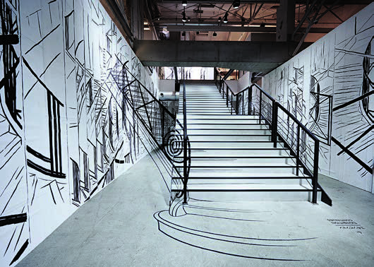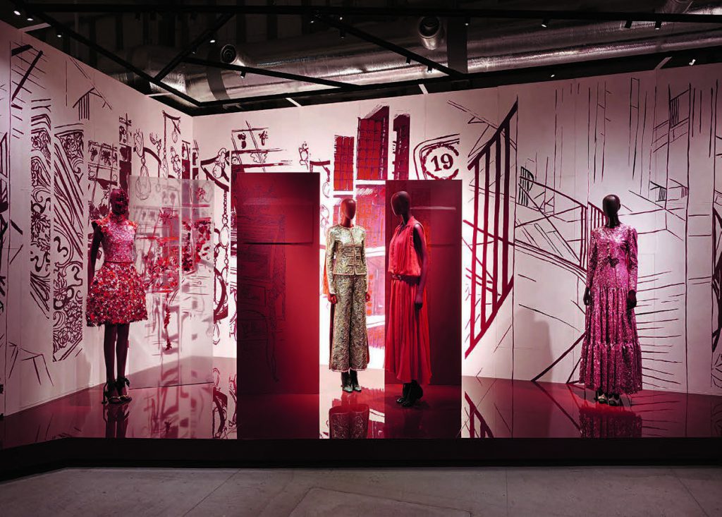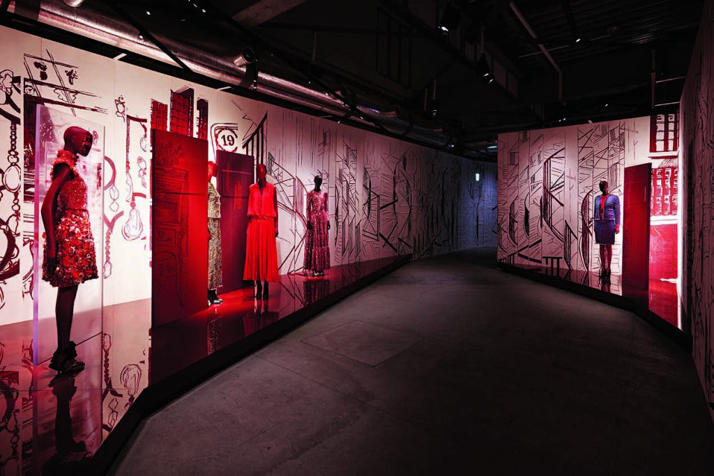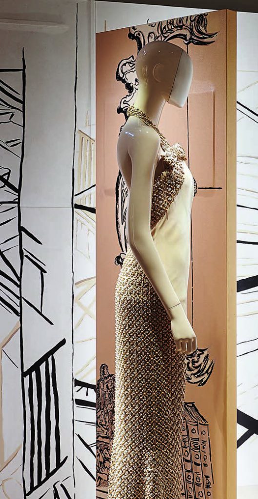 Chanel’s Métiers d’art are showcased at the entrance of the exhibition with an interpretation of the door to the Creation studio at 31 Rue Cambon, embroidered by the House of Lesage. This focus is also expressed with each of the doors that lead into the five sequences of the exhibition reinterpreting an embroidery motif made by the Métiers d’art and each inspired by an haute couture silhouette of the sequence.