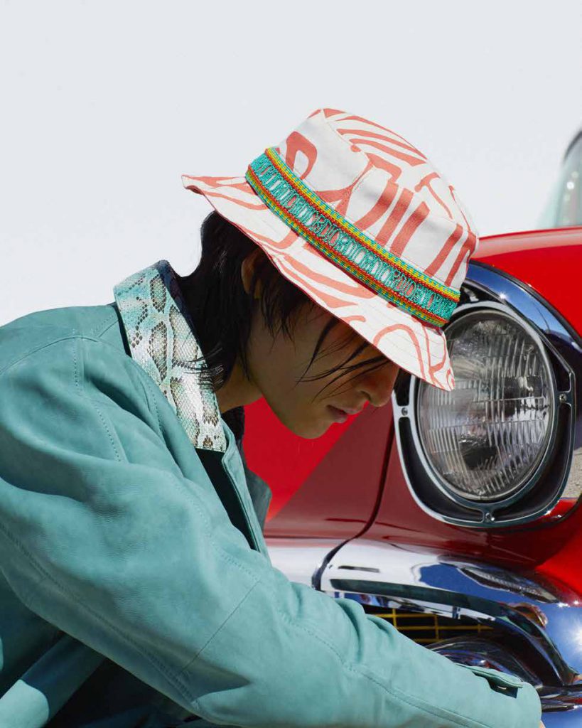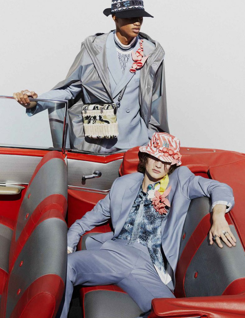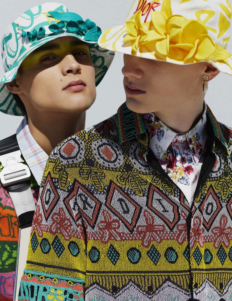 LATINO HEAT MIAMI’S MUSCLE BEACH SOUTH BEACH AND NIGHTLIFE GLAMOUR AFTER DARK. KIM JONES’ DIOR MEN COLLECTION GIVES US CAMP-COLLAR SHORT-SLEEVE SHIRTS – A CARIBBEAN DREAM. CHE GUEVARA BERETS – GUERRILLERO HEROICO – IN TECHNICOLOR CROCHET LIKE COLONIAL HOUSES IN HAVANA. AND BUCKET HATS WITH LILY OF THE VALLEYS STITCHED IN COTTON, COURTESY OF STEPHEN JONES. THE DELICIOUSLY FAMILIAR STÜSSY SCRAWL, IN A COLLAB WITH SHAWN, REIMAGINES THE DIOR LOGO AND UPDATES NINETIES NOSTALGIA FOR A BRIGHT AND VIBEY NEW DAY.