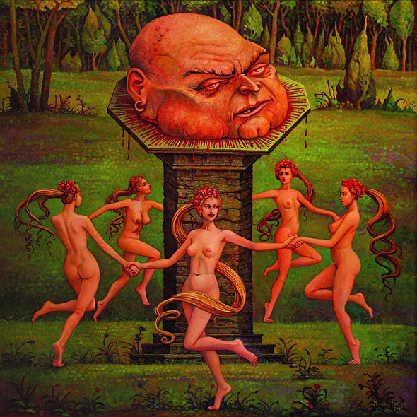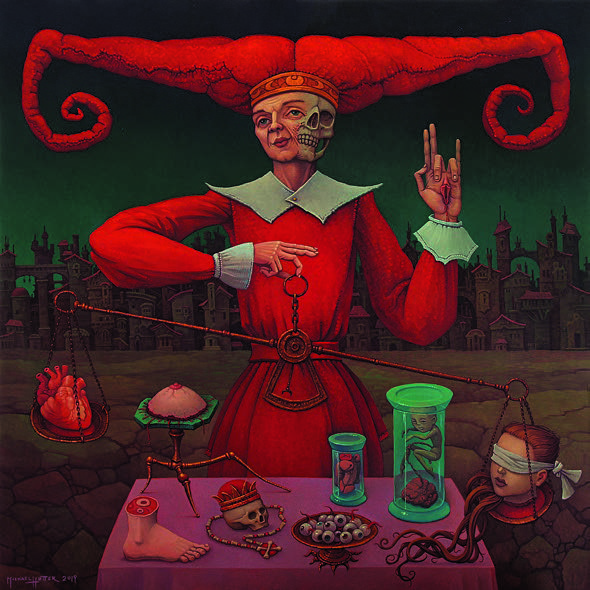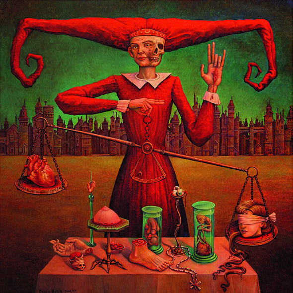 A: I do not choose the colors consciously. I choose them only by feeling. But I want my paintings to be intense and extreme and the colors as saturated as possible. Red is a strong signal, mostly a warning. But it can also be of immense beauty. And just as contradictory are many things that are red. Blood is the fluid that keeps us alive, but if you spill it, it symbolizes murder and violent death. The use of fire started human civilization and its misuse will probably end it. The Devil is also associated with red and he is as dangerous as seductive...